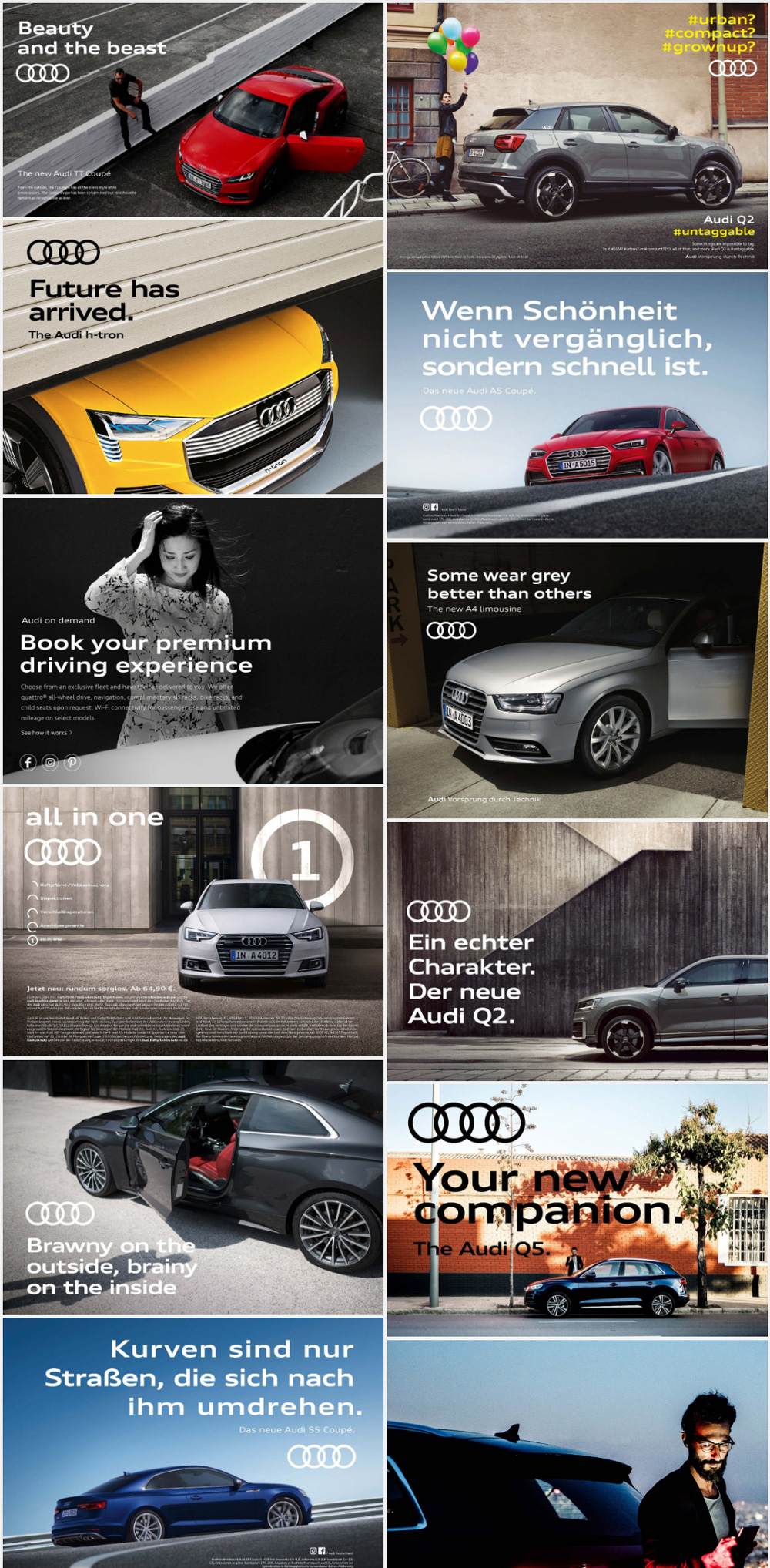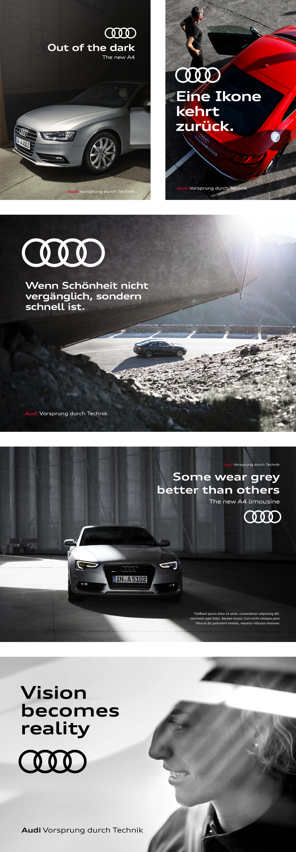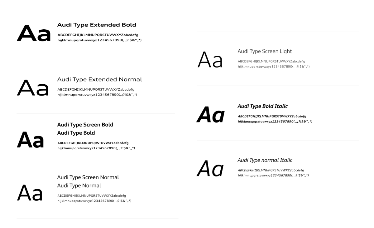 正如你已经知道的,去年奥迪已经推出了平面版本的标志,但是对外公布的仅有新的扁平化标志,没有具体的品牌案例研究。今年早些时候,奥迪在品牌门户网站上发布了一个非常全面,非常精美的品牌形象,详细说明了品牌形象的应用。该项目由斯图加特和柏林的Strichpunkt和位于慕尼黑的KMS团队进行合作。