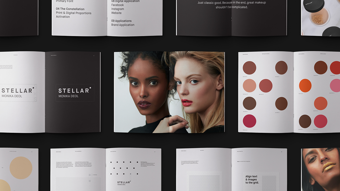品牌视觉灵感源于宇宙和星空,品牌标志和名字喻示着星星的星座。字体标志中包含一个与北极星和美痣相呼应的小圆点。使用的颜色反映了品牌的包容性和调性。黑色和白色代表夜晚和白天,而二次乳白色调色板在整个光线上振动。品牌准则中确保产品的摄影和模型照片的拍摄表现了Stellar的轻松、自信和大胆的品牌精神。
